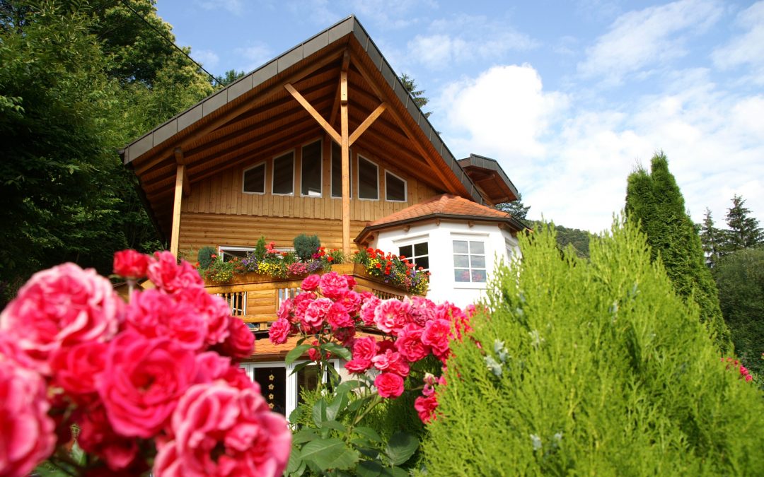 Ferienwohnungen Schimpf Sankt Martin, südliche Weinstraße/Pfalz, Haus Ansicht Ostseite, idyllisch für Naturverbundene und ideal für Ihren Wanderurlaub, im Sommer eine Blütenpracht