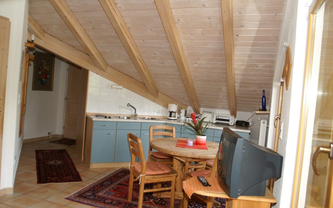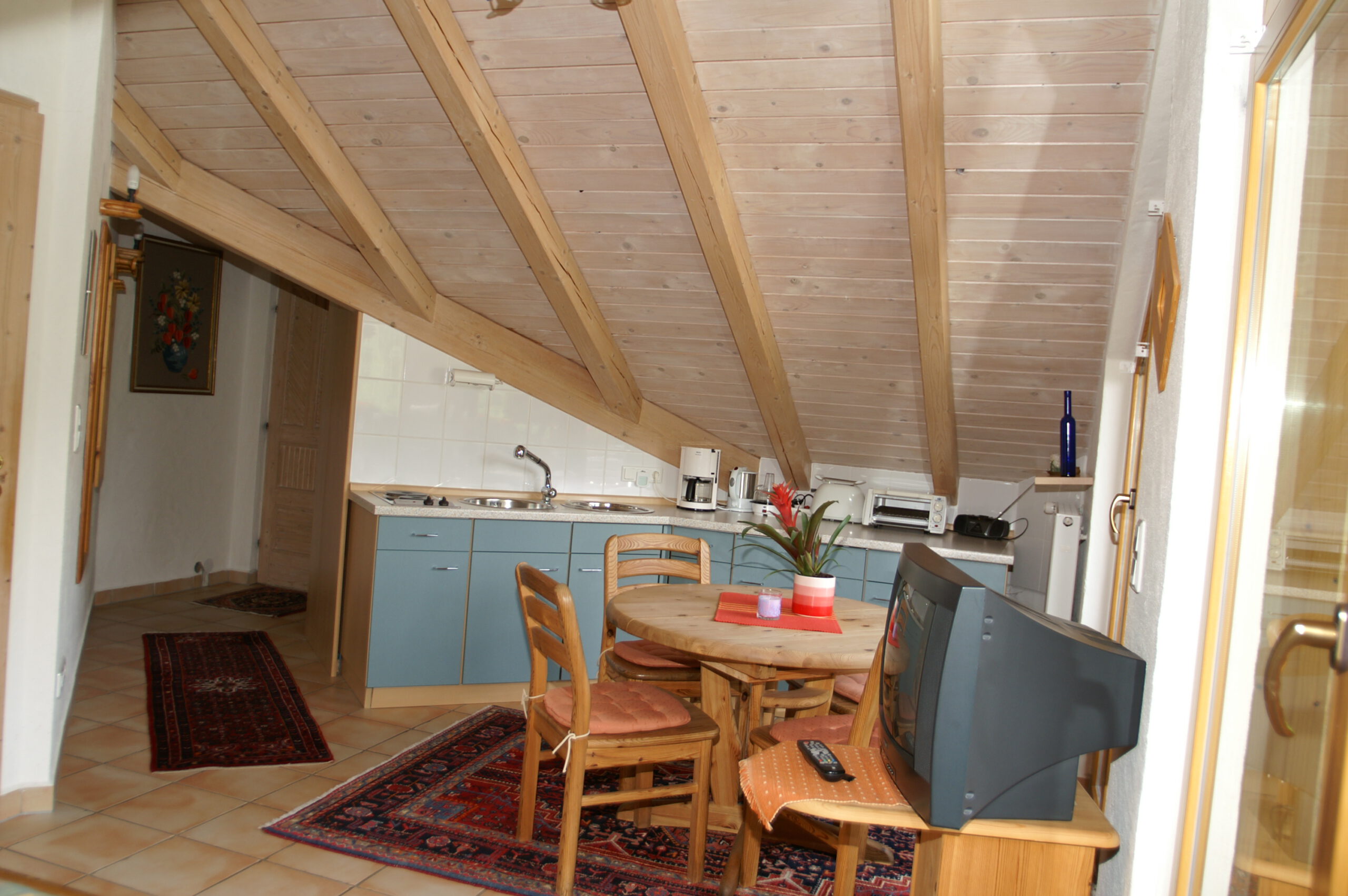 Kochnische mit voller Ausstattung, Kühlschrank, Geschirr, Kaffeemaschine, Wasserkocher, Toaster, kleiner Backofen, Geschirrhandtücher, Töpfe, Pfannen