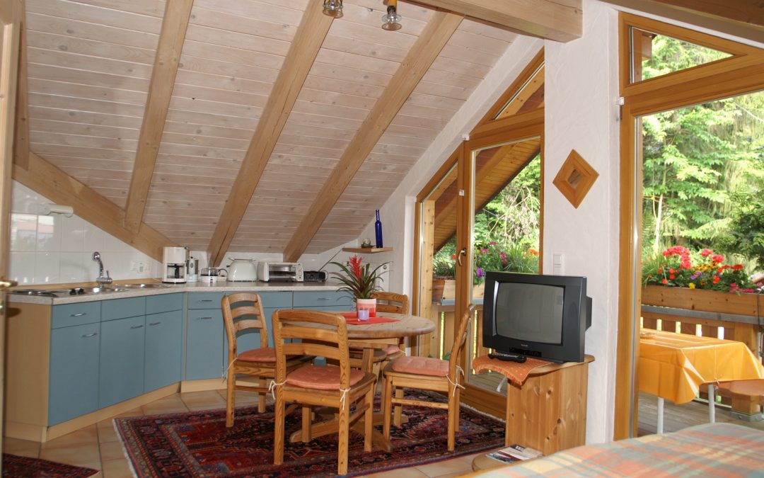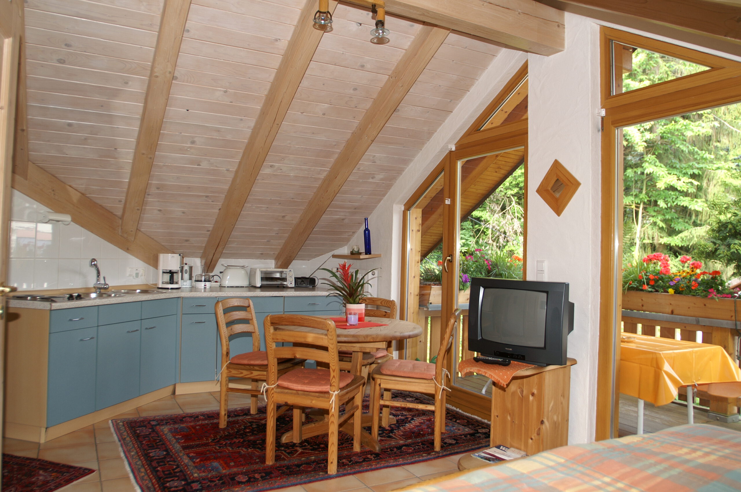 Kochnische mit voller Ausstattung, Kühlschrank, Geschirr, Kaffeemaschine, Wasserkocher, Toaster, kleiner Backofen, Geschirrhandtücher, Töpfe, Pfannen